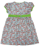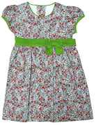 This sweet floral dress is crafted from lightweight cotton and features an all-over berry and blossom print in shades of red and green. A wide green corduroy 21-wale waistband with an attached bow adds a charming contrast and defines the waist beautifully. The dress includes puff cap sleeves with green piping and a gently gathered skirt for a classic silhouette. Fully lined for comfort, it’s perfect for parties, holidays, or everyday elegance.