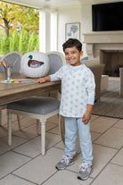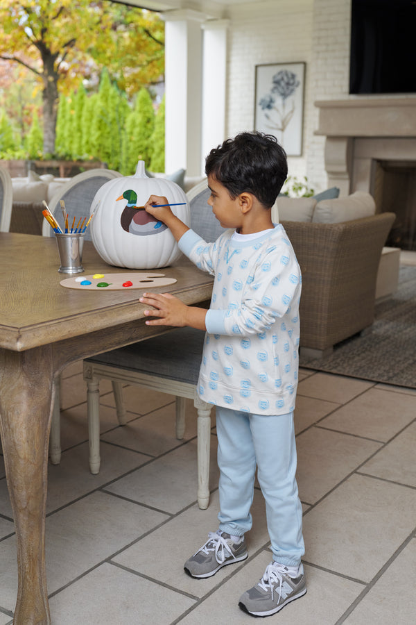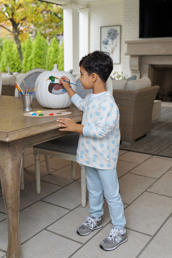 Our Cassidy Comfy Crewneck featuring Vintage-Prep Pumpkin Pails with Buckhead Blue is perfect for seasonal everyday wear. Your little ones will love how soft & warm this crewneck is, and you'll love how practical it looks!