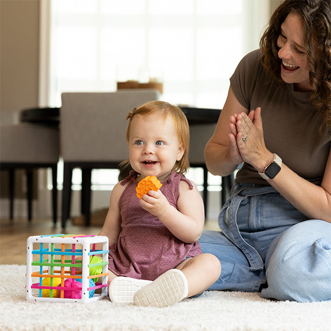 But the best part? As kids push the shapes through the elastic bands of the cube, curiosity is sparked and young minds can't help but explore, experiment, and discover.