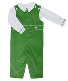 Dress him in timeless style with this classic green longall, perfect for holidays, special occasions, and family portraits. Crafted in a vibrant green fabric, this traditional piece features crisp white piping along the collar, cuffs, and waistline, adding a tailored finish. The buttoned straps and faux pocket detail bring a charming touch of vintage inspiration, while the soft cotton blend ensures all-day comfort. Layered over a crisp white shirt with coordinating piped cuffs, this outfit is both polished and practical.