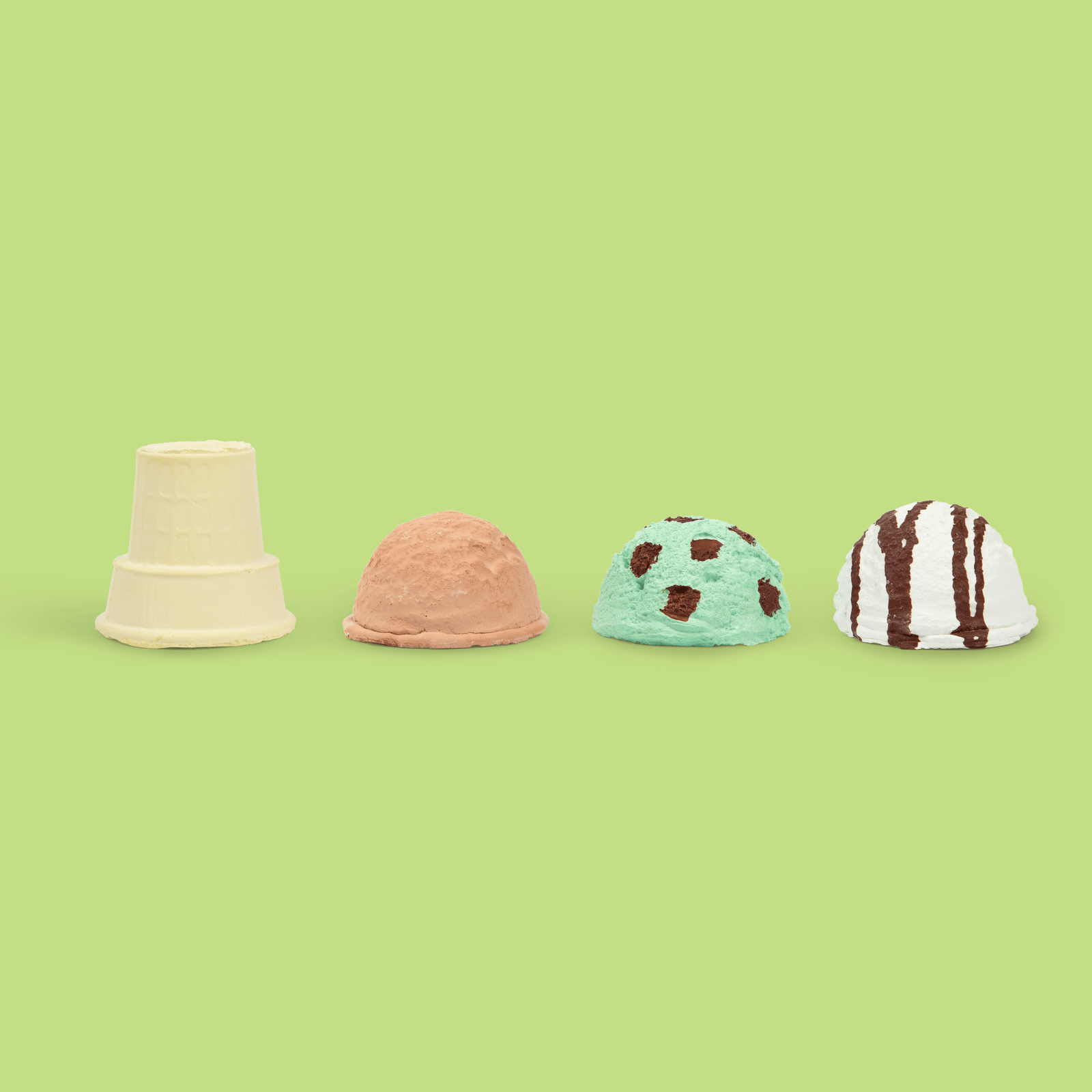 • 3 ice cream scoops - 1 green, 1 white, 1 brown, 1 yellow cone