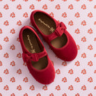 The shoes feature a hook and loop closure for effortless and secure fitting, accentuated with a glamorous velvet bow on the side of the strap for a modern and fashion-forward look. The grosgrain piping detail around the shoe adds a contemporary edge to the classic Mary Jane style.