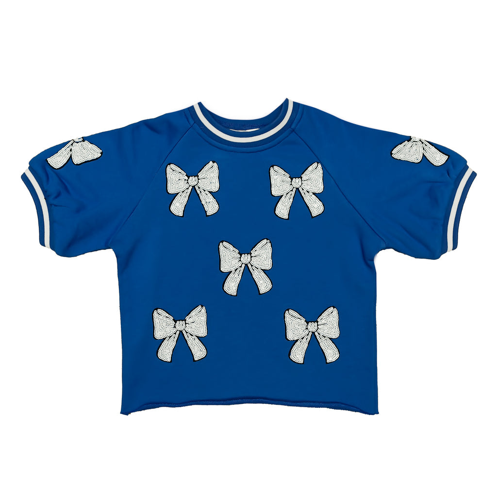 Add a sparkling touch to your game day look with the Royal and White Bows Top. Featuring playful sequin bows, this top brings girly charm and festive flair to any outfit. Perfect for cheering on your team in style while shining bright from the stands.