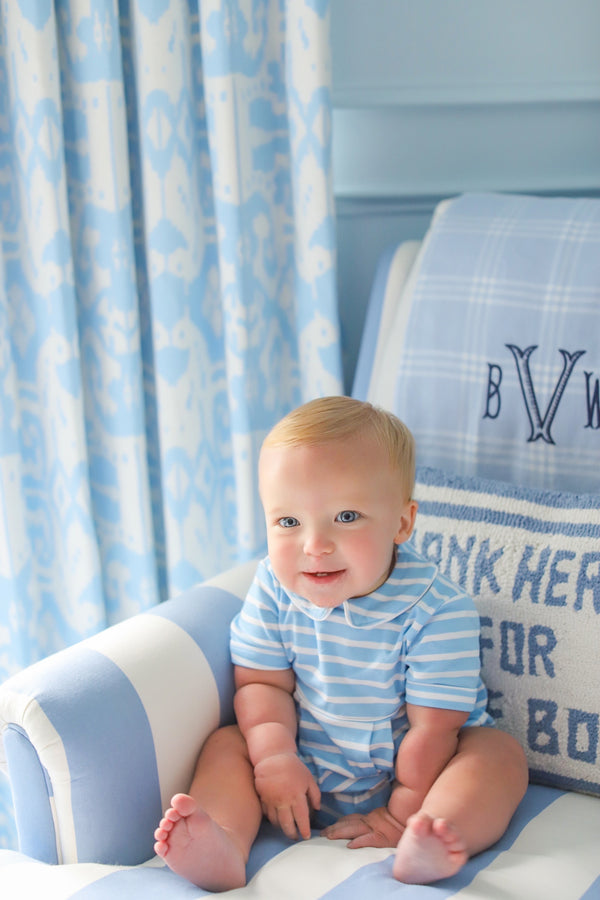 Long Sleeve Sir Proper's Romper - Beale Street Blue Stripe with Worth Avenue White