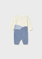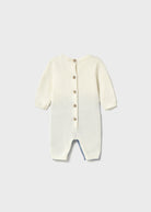 Long sleeved One-Piece for newborn baby boy. Round neckline. Snap button fastening at crotch for easy dressing. Button fastenings down the back to allow the garment to be put on and taken off easily. Knitted fabric, soft and pleasant to the touch.