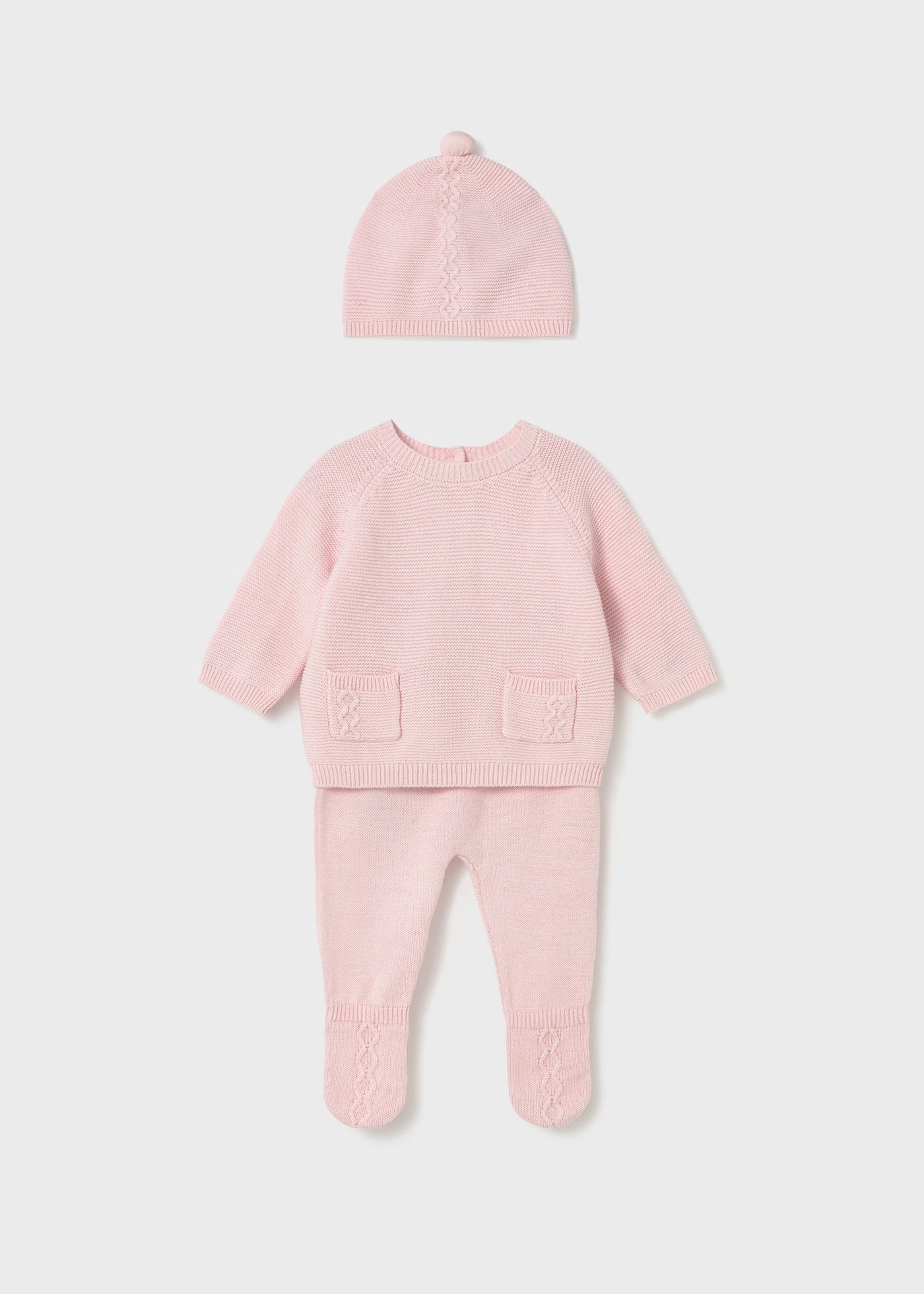 Adorable three-piece outfit for newborns, made from soft, comfortable knit fabric. Raglan-sleeved sweater for newborns with button fastening at the back for easy dressing. Features functional front pockets and decorative braided details. Footed pants with an elastic waistband and ribbed trim details. For sizes 6–9 to 18 months, the design does not include feet to allow better mobility and increased comfort. The stretchy waistband adjusts to your baby’s growth. Sweet newborn hat with ribbed trim details. This set comes in a Newborn gift box, perfect for special occasions.