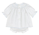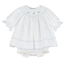 This sweet three-piece set includes a smocked dress, matching bloomers, and a coordinating bonnet. It is perfect for a taking home your newborn and classic portraits.