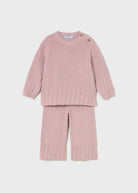 This baby outfit includes a matching sweater and pants crafted from soft, knitted fabric with recycled polyester. The long-sleeved sweater features a round neckline and button closures on the shoulder, complemented by decorative openings and braided accents. The pants offer an elastic waistband for comfort, adorned with elegant braided details.