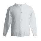 Fine knit unisex cardigan with mother of pearl buttons opening down the front and ribbing at neckline, cuffs and hem. This light weight sweater is the perfect accent to transition your wardrobe as the weather cools. Wash and wear poly cotton blend.
