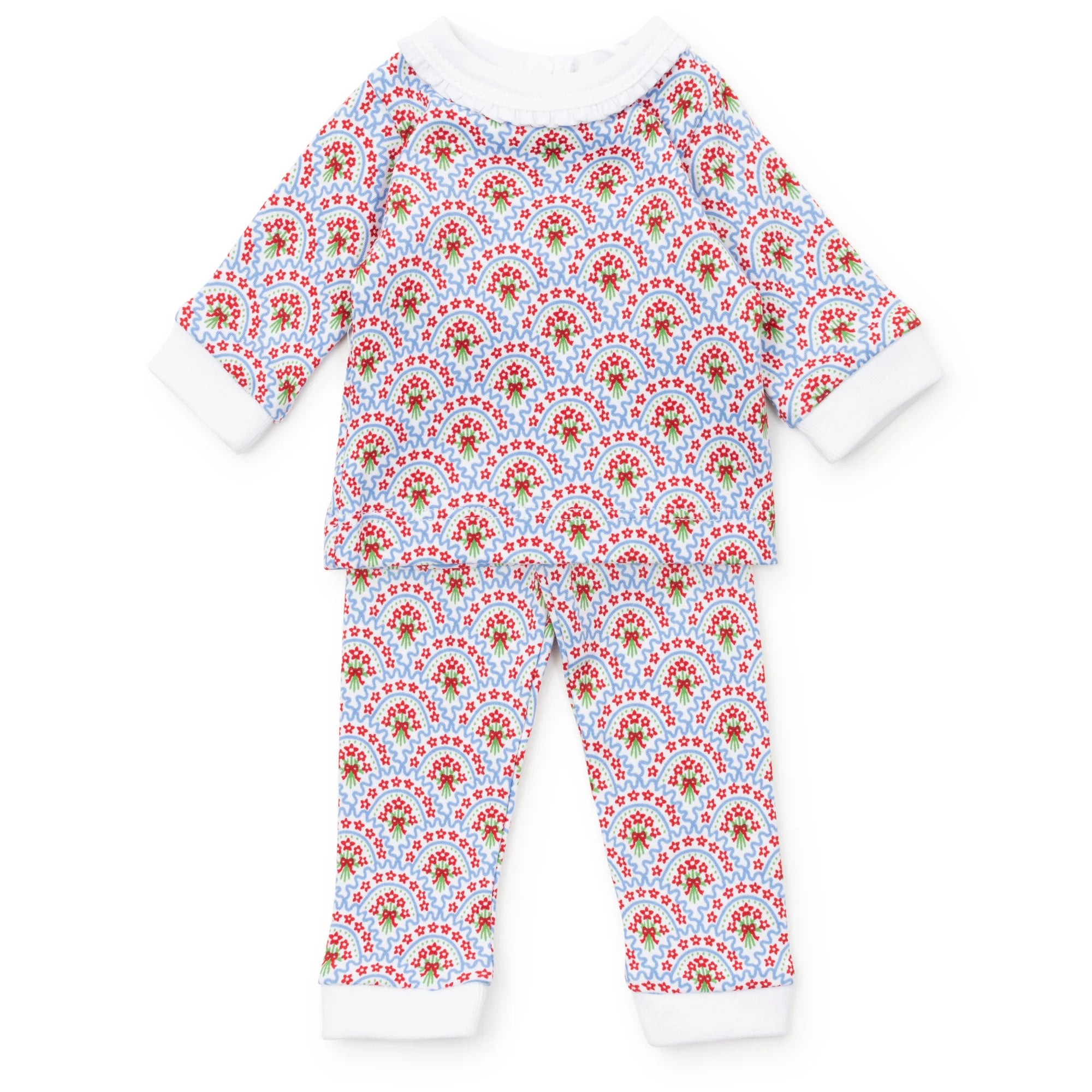 Pima cotton long sleeved pajama top and pant set. Pants have an elastic waistband, and the long-sleeved top has a small, ruffled detail around neck and button closure in the back. Made from 100% Peruvian Cotton. For child's safety, garment should fit snugly. This garment is not flame resistant. Loose fitting clothing is more likely to catch fire.