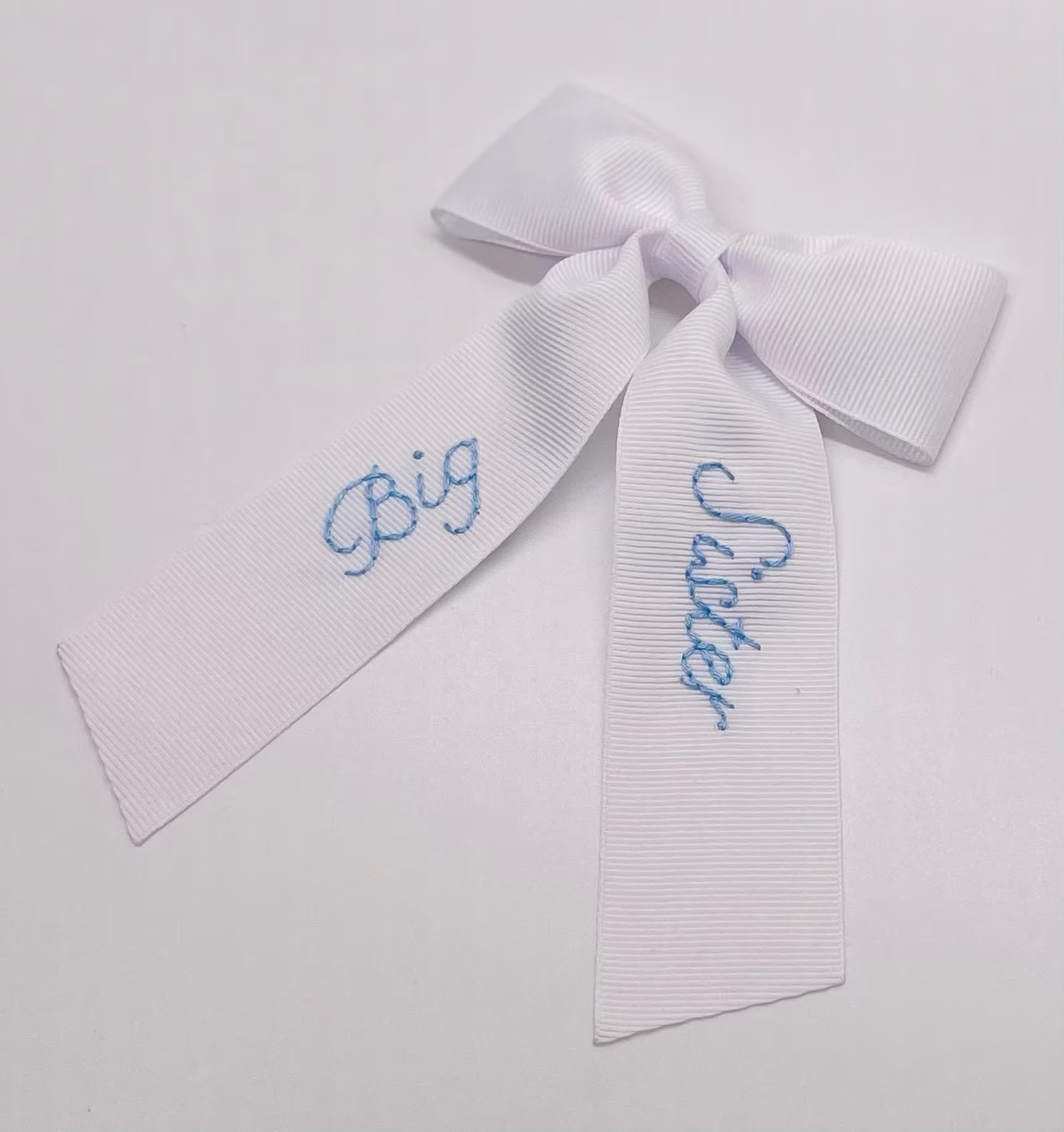 Hand-embroidered "Big Sister" on a white bow with a either pale blue or Pale pink thread. This ribbon is 1.5 inches wide. The finished bow is 4.5 inches across and about 8 inches tall. The attachment piece is an alligator clip. Certainly one of our best sellers.