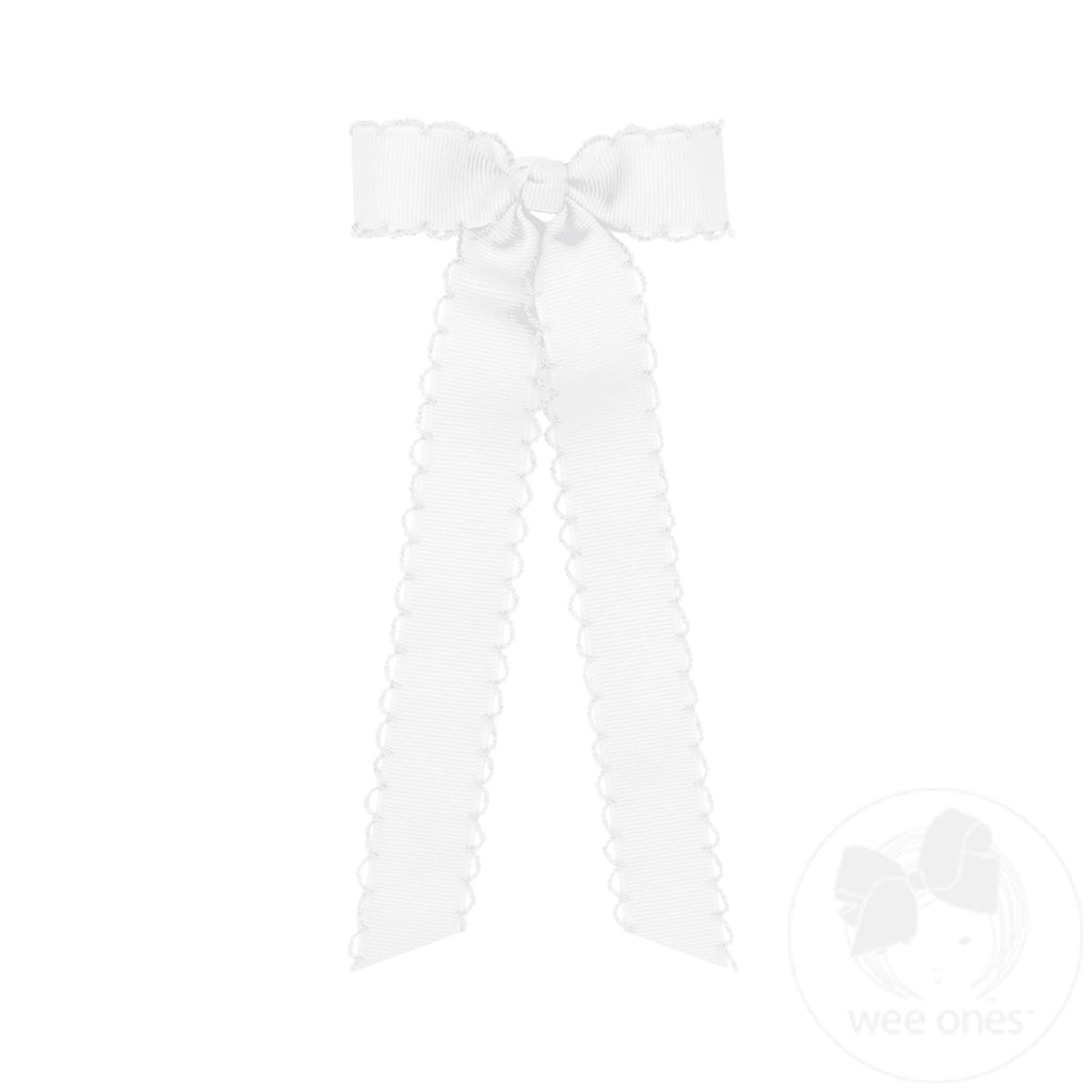 Mini Grosgrain Bowtie with Matching Moonstitch Edge, Knot Wrap and Streamer Tails - White