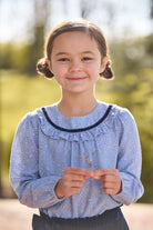 Introducing our new Greystone Floral, a timeless print featuring delicate white flowers and rich navy velvet accents. Our Amelia Blouse features navy velvet and a ruffle around the collar. Dress it up with our Paperbag Bow Skirt in Navy Velvet or pair with our Kick Flare Legging in Navy for a more casual look. Looking for fall family photo outfits? This floral pairs perfectly with our Gray Blue Gingham for coordinating sibling looks.