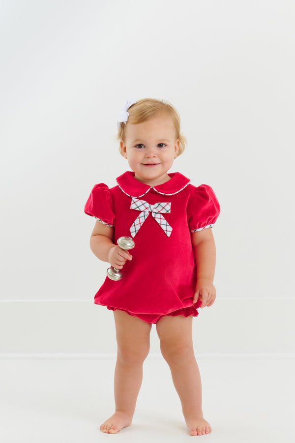 Dress your little one in timeless elegance with our Banks Bow Bubble in Richmond Red Velveteen with Old Town Tattersall bow. It combines charm with comfort for any occasion this holiday season.