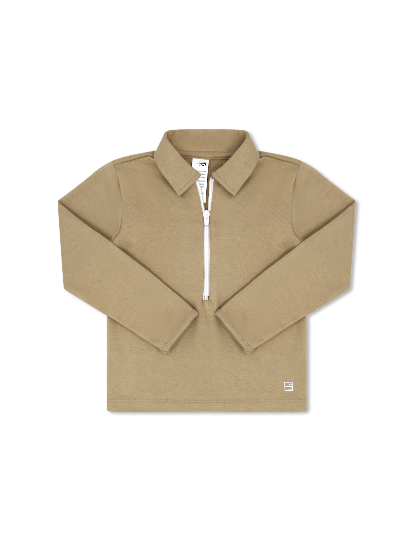 The Henry Half Zip is the perfect layering piece for those cooler days. The lightweight knit fabric in Kickoff Khaki with Pure Coconut zipper and is a much needed for our basic pieces.