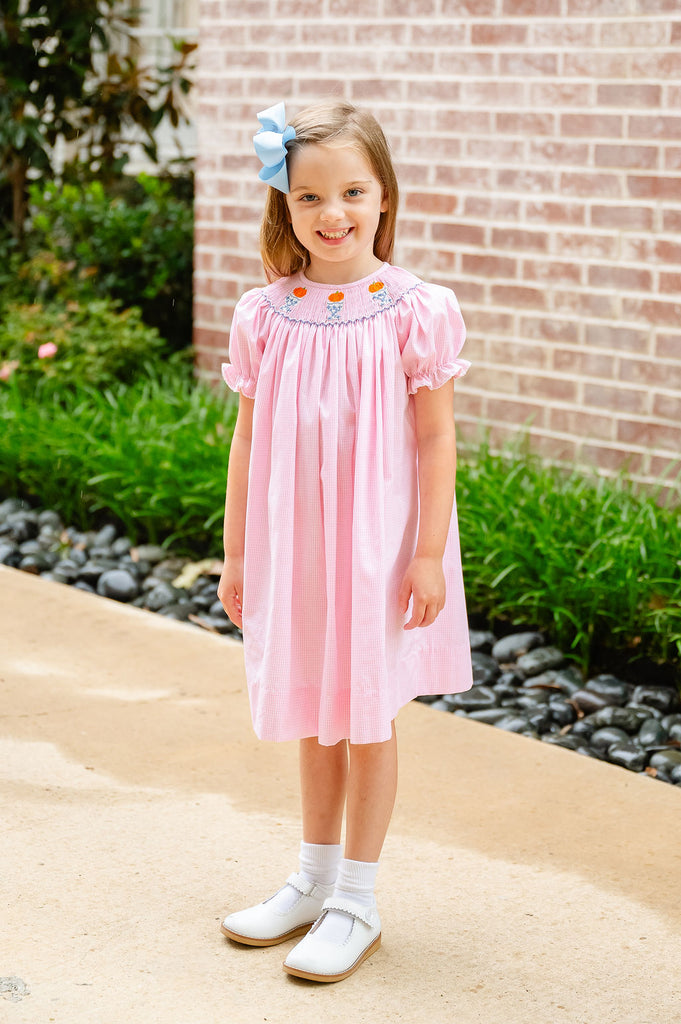 - Pink gingham with smocked pumpkins and ginger jar detail