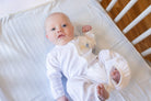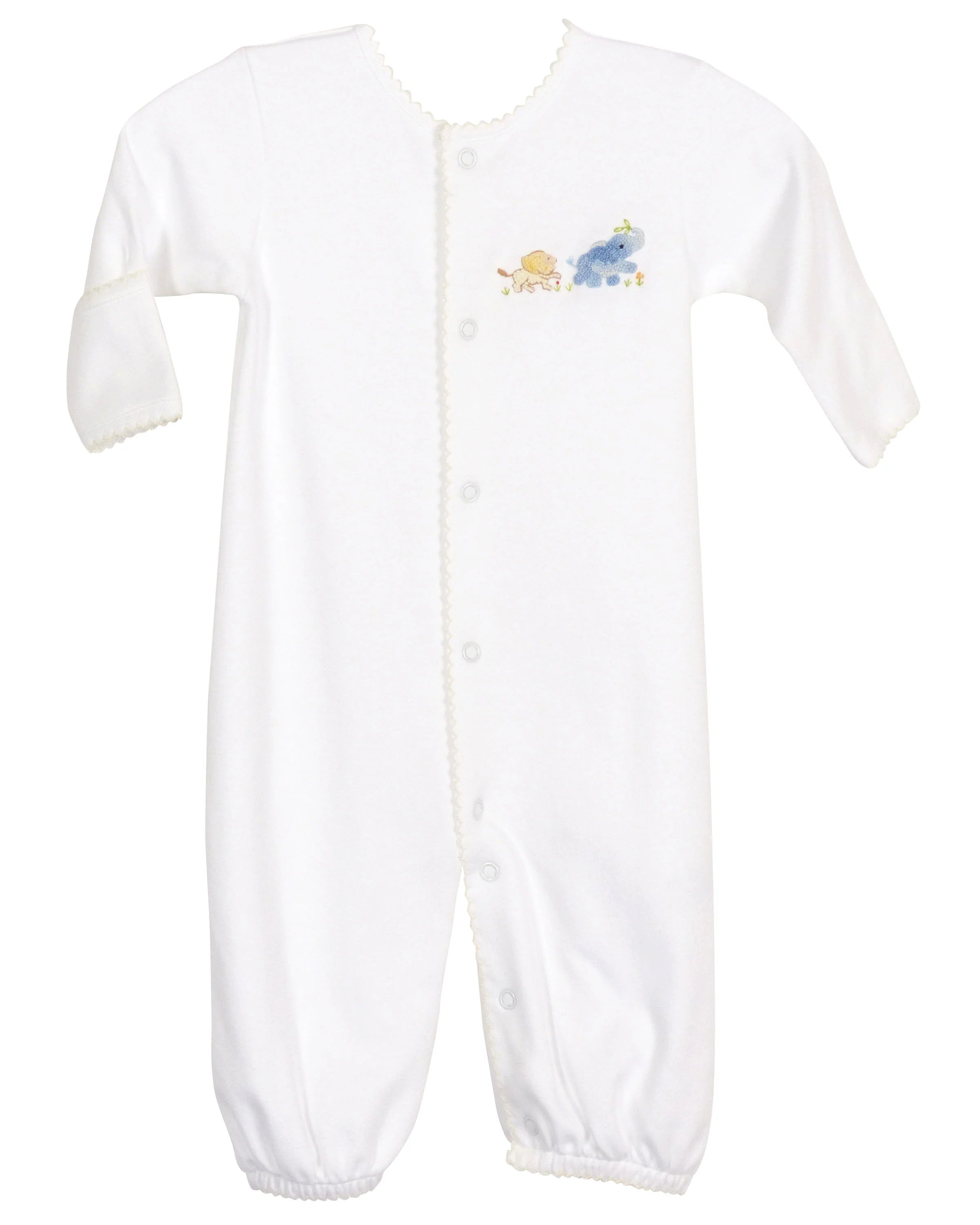 Introducing the Animal Safari heirloom knit baby converter gown - a timeless classic for your newest little arrival. Designed to create cherished memories for generations to come. Made with premium 100% Egyptian cotton knit fabric to ensure your little lambie will stay as cozy and they are cute. The delicate hand embroidered details of elephants and lions makes this the perfect outfit for everyday wild adventures. Can be worn as a gown or with pant legs.