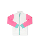 Our Juliet Jacket in Pure Coconut athleisure with Flamingo Pink and Totally Turquoise is the perfect layering piece for your girls wardrobe. It will keep her warm and cozy to and from all her activities.