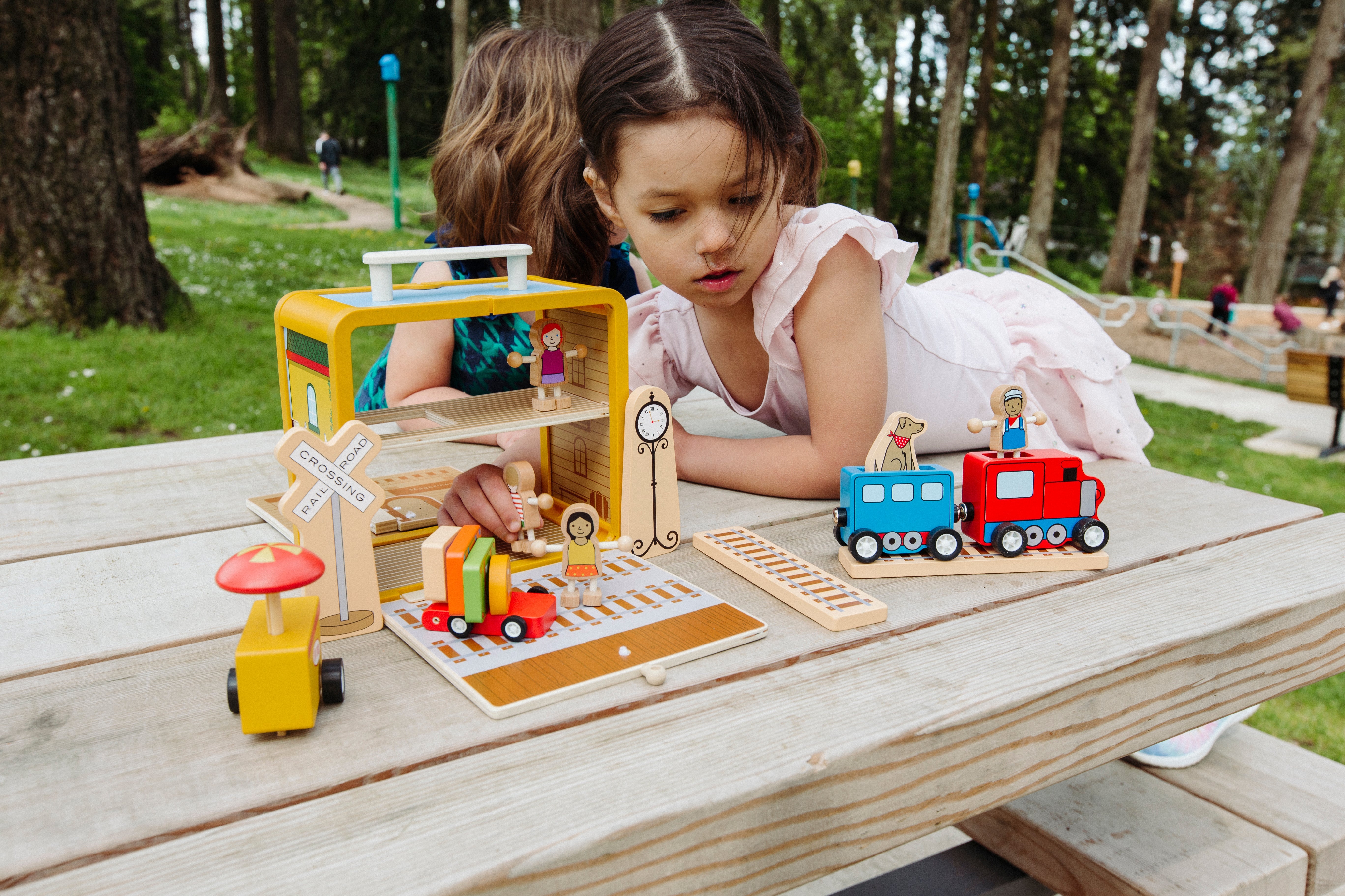 ALL ABOARD! Part of our new Suitcase Series that encourages portable play, our Train Station suitcase opens up on both sides to reveal a world of fun. This 16-piece set will let your child’s imagination run wild with train station stories. Includes travelers, crossing signal, extra track, luggage, hot dog cart and more!