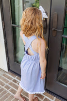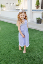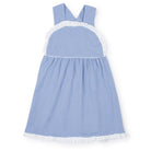 Girls' cross back sleeveless pima dress with ruffles. Snaps secure the straps in back. Gathered waist in the back. Coordinates with the Eloise Bubble.