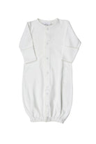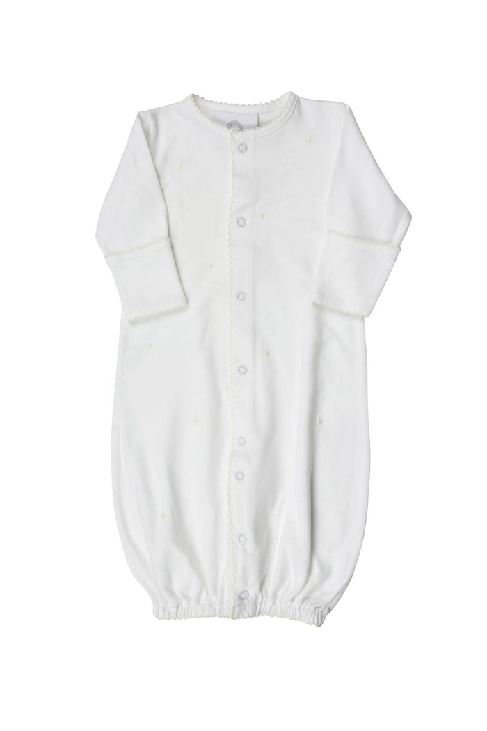 Layette pima gown with dots, elastic at bottom. A customer favorite! So classic and gets softer with each wash. 100% cotton. Buttons up front and mitten cuffs!