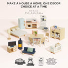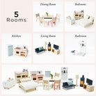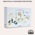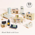 Furnish your miniature play universe with this stunning 35-piece furniture set. Ready to dress any dream home, moving in day has never looked so good. Featuring natural soft tones and lots of exposed wood, add instant style to your little ones dolls house with this amazing starter set which includes a kitchen, a living room with a log burner, a bedroom with a double bed, bunk beds and a cot, a shower room, plus a dining table and chairs and lots more! Compatible with all our dolls, dolls houses and accessories.