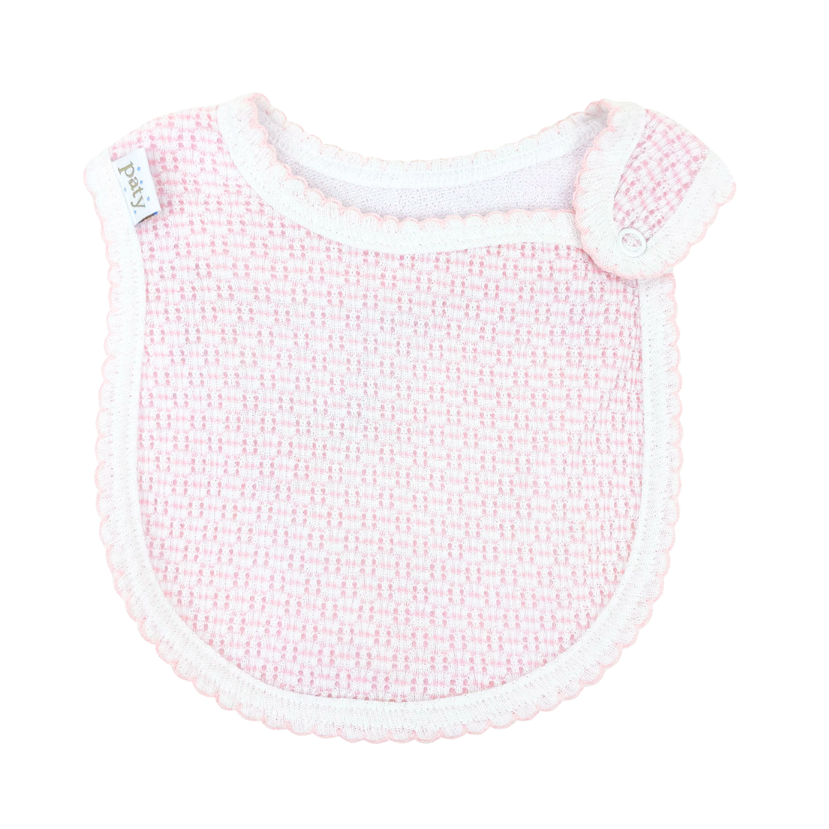 A sweet and practical essential, our shoulder snap bib is crafted from our signature Paty Knit fabric, designed to be soft and absorbent to help keep baby clean and comfortable throughout the day. The textured knit and delicate scalloped trim add a refined, classic touch, while the shoulder snap closure allows for easy on and off. Perfect for daily feedings, outings, and thoughtful gifting, this bib blends everyday function with a polished, heirloom-inspired look. Made in the USA.