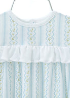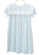 Dress your little one in classic charm with the Pima Lily Trellis Ruffle Dress. Made from 100% soft Pima cotton, it features a delicate Lily Trellis pattern in blue and white. A sweet white ruffle across the bodice adds an extra feminine touch, perfect for school, parties, or any special occasion.